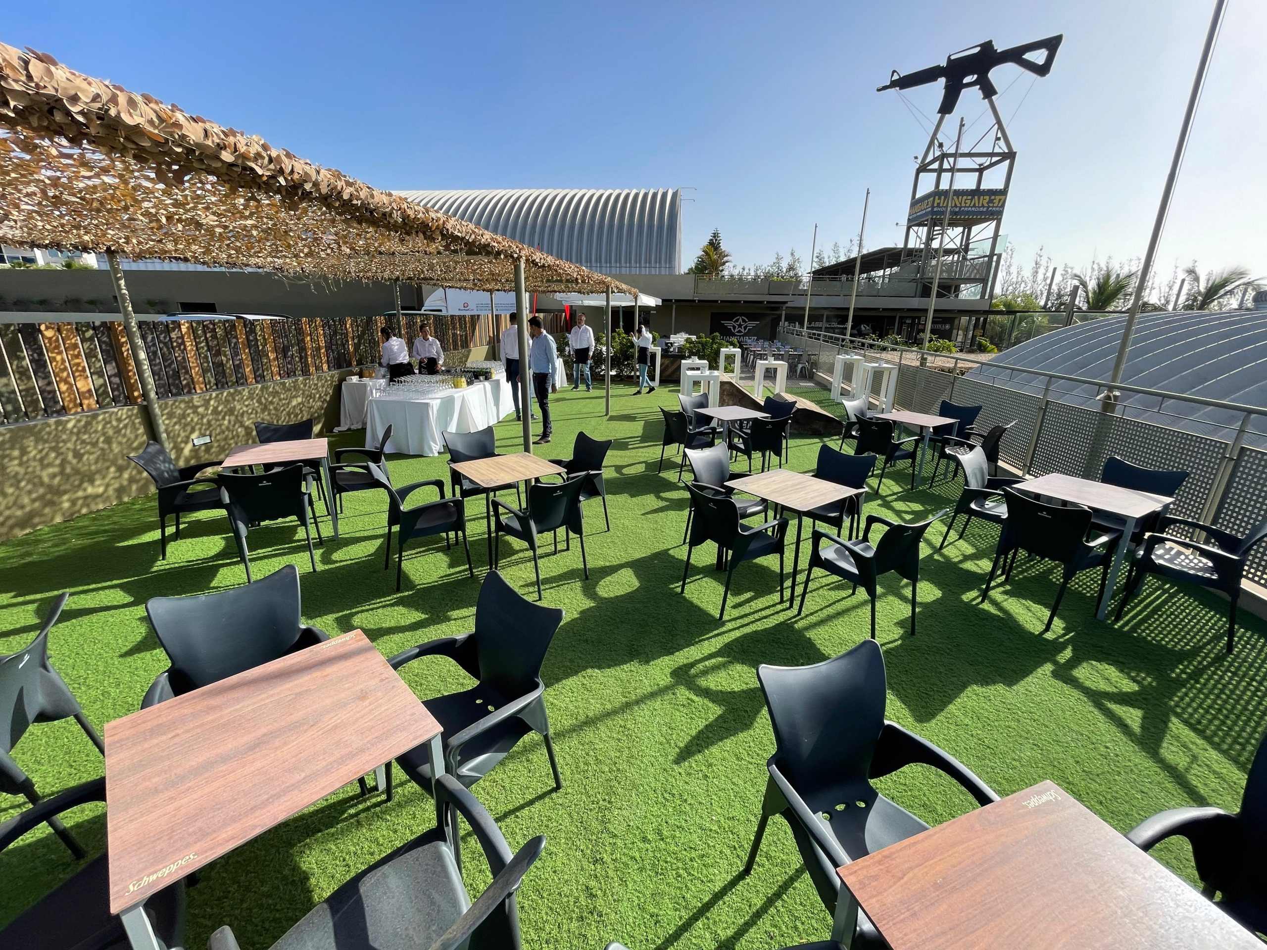Este enorme hangar tiene una gran terraza techada delante con vistas al mar y al campo de batalla, esta característica es perfecta para tener dos espacios diferentes en cualquier evento y que además sirve como zona de catering o asaderos.